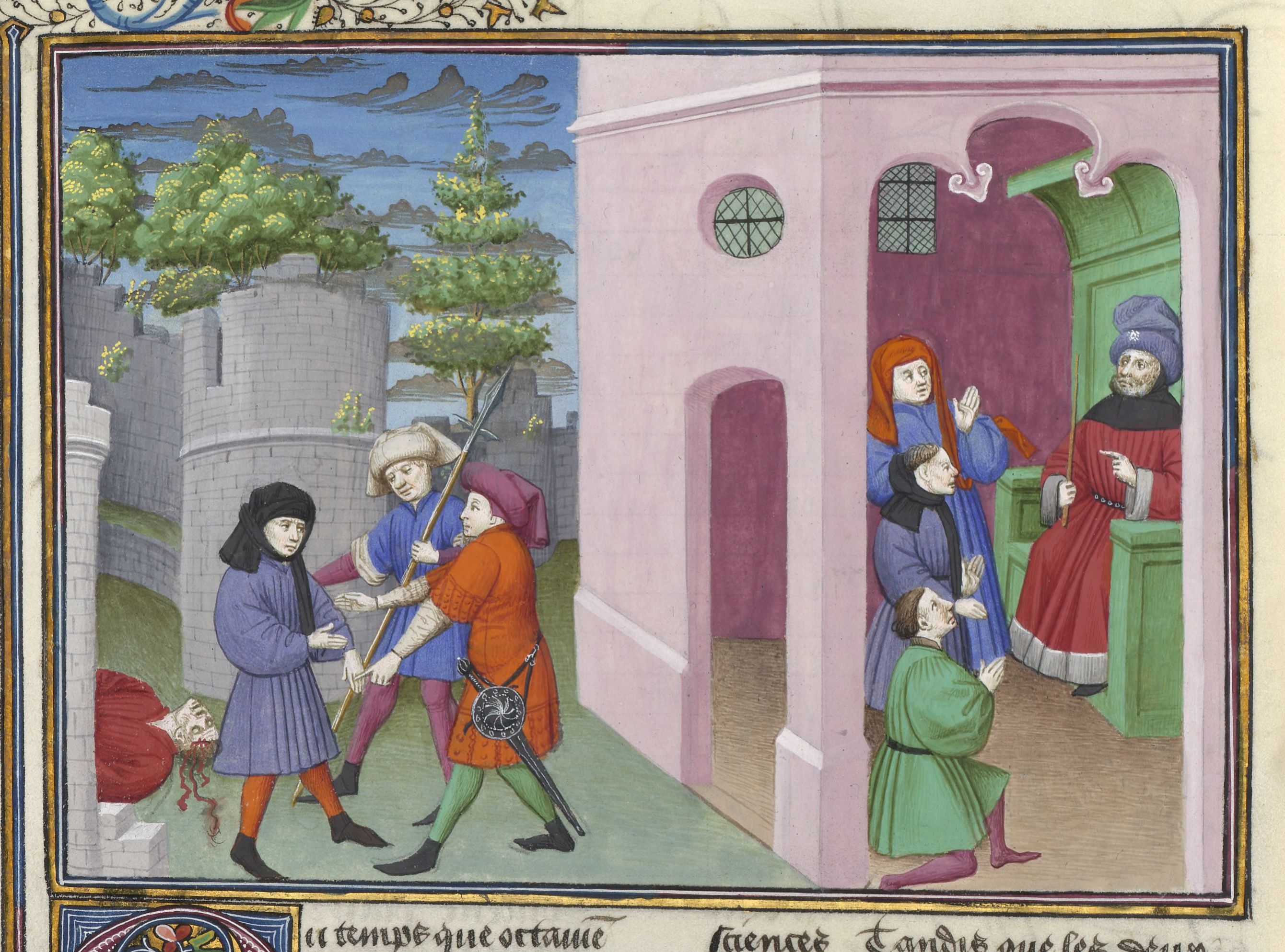 Maestro di Jean Mansel (1430-1450), Gisippo viene accusato di omicidio; Gisippo, Tito e l'omicida confessano dinanzi al giudice