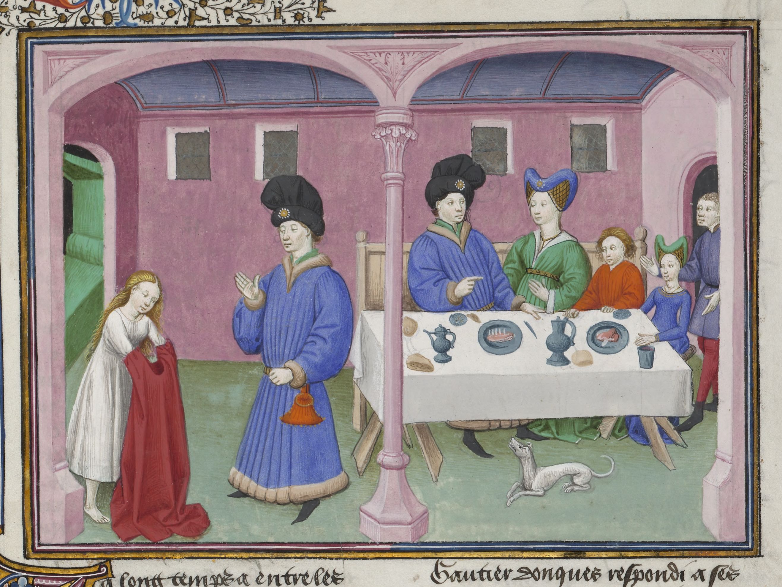 Parigi, Bibliothèque de l'Arsenal, 5070, f. 387r. Il copista del manoscritto è Guillebert de Mets. Gualtieri ripudia Griselda, lasciandole solo una camicia; Griselda viene riaccolta nella casa del marchese e si ricongiunge con i propri figli.