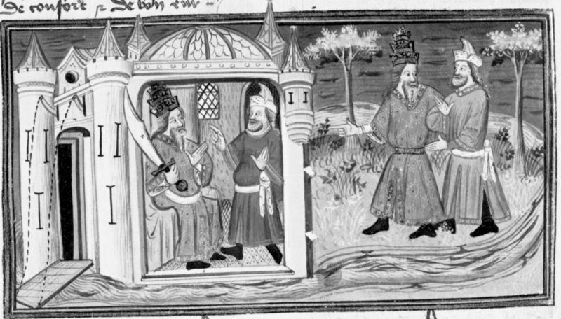 Parigi, Bibliothèque Nationale de France, Fr. 12421, f. 23v. Al cospetto del Saladino, Melchisedech racconta la parabola dei tre anelli; i due uomini, divenuti amici, attraversano la città.