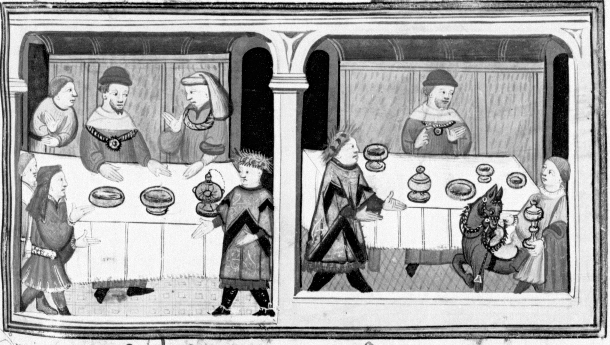 Parigi, Bibliothèque Nationale de France, Fr. 12421, f. 33r. Il novellatore Bergamino viene ricevuto alla tavola di Cangrande della Scala; Bergamino riceve ricchi doni, tra cui una veste sontuosa ed un cavallo.