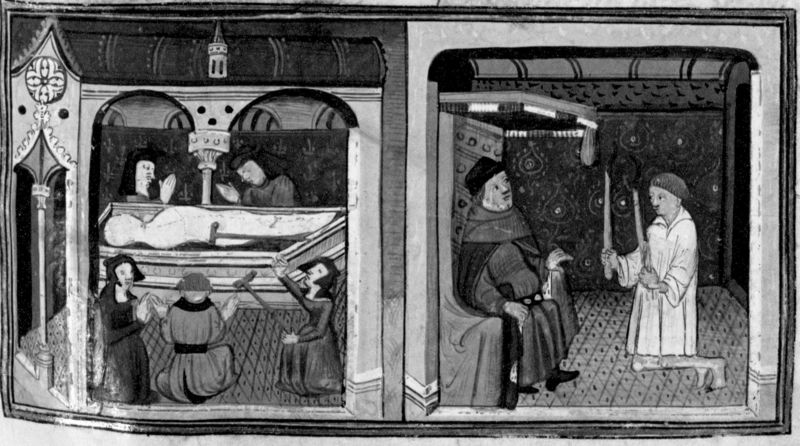 Parigi, Bibliothèque Nationale de France, Fr. 12421, f. 45r. Martellino, fingendosi storpio, si mescola alla folla di fedeli per entrare in chiesa e vedere la salma di Sant'Arrigo; scoperto l'inganno Martellino, in camicia e con due ceri (?) in mano, si trova in tribunale dinanzi al giudice.
