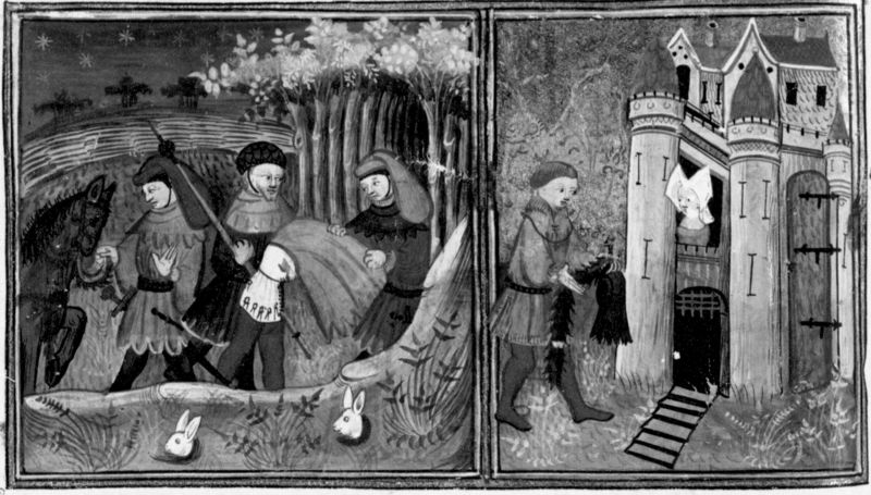 Parigi, Bibliothèque Nationale de France, Fr. 12421, f. 48v. Il mercante Rinaldo d'Asti viene derubato e spogliato da tre banditi sulla strada per Verona; Rinaldo, dopo aver ricevuto nuovi vestiti, si congeda dalla vedova che lo ha soccorso.
