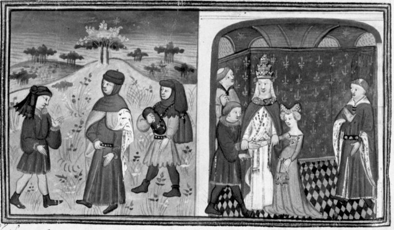 Parigi, Bibliothèque Nationale de France, Fr. 12421, f. 52v. Alessandro incontra sulla strada la principessa d'Inghilterra, travestita da giovane abate; Alessandro e la principessa sono uniti in matrimonio dal Papa.