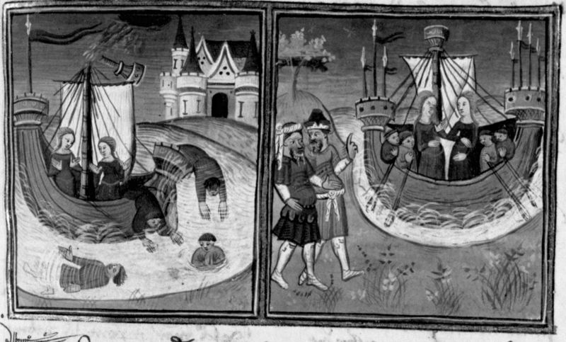 Parigi, Bibliothèque Nationale de France, Fr. 12421, f. 77r. La nave di Alatiel fa naufragio; alla fine del viaggio Alatiel ritorna in nave dal re suo padre e dal suo promesso sposo.