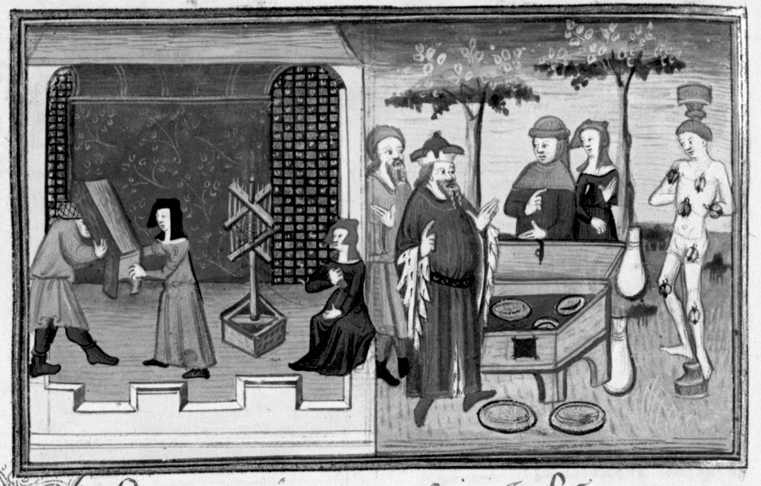 Miniatore francese (1425-1450), Ambrogiuolo si fa portare in casa di Bernabò dentro una cassa; Ambrogiuolo viene punito per il suo inganno