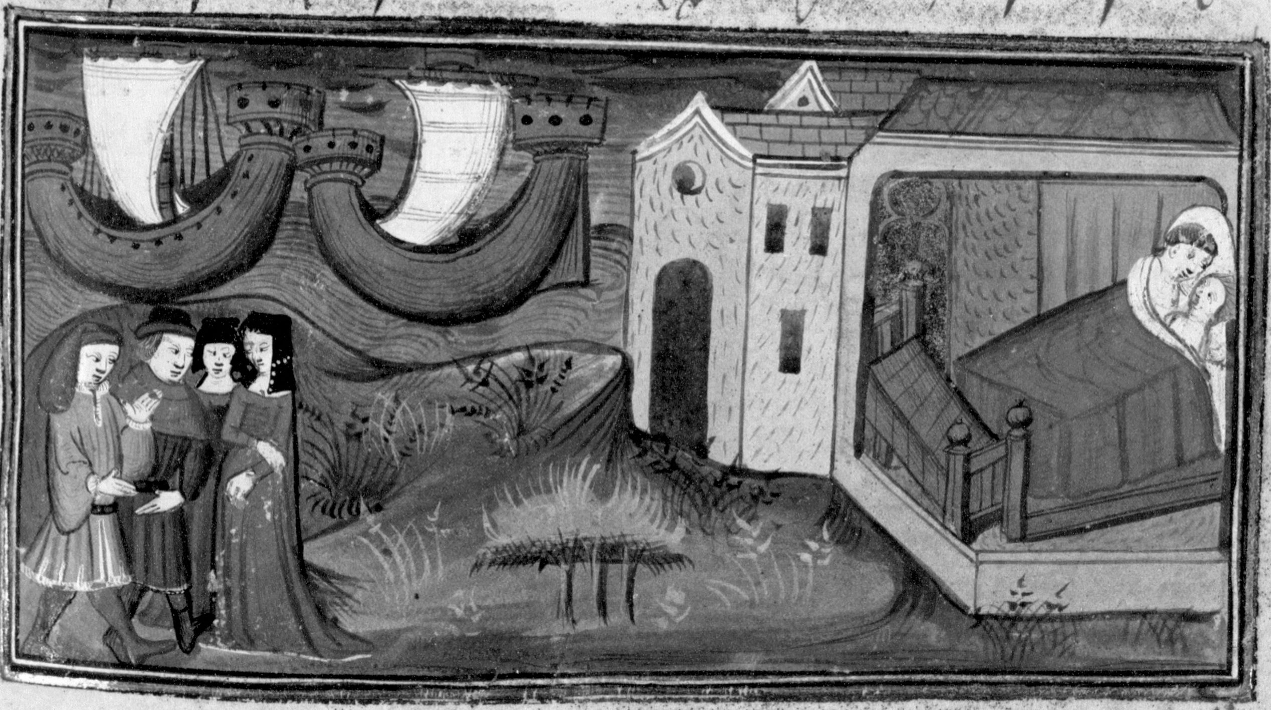 Parigi, Bibliothèque Nationale de France, Fr. 12421, f. 134r. Due coppie di nobili napoletani, tra cui Ricciardo Minutolo e Catella, si incontra sulla riva del mare; Ricciardo e Catella giacciono insieme nei bagni cittadini.