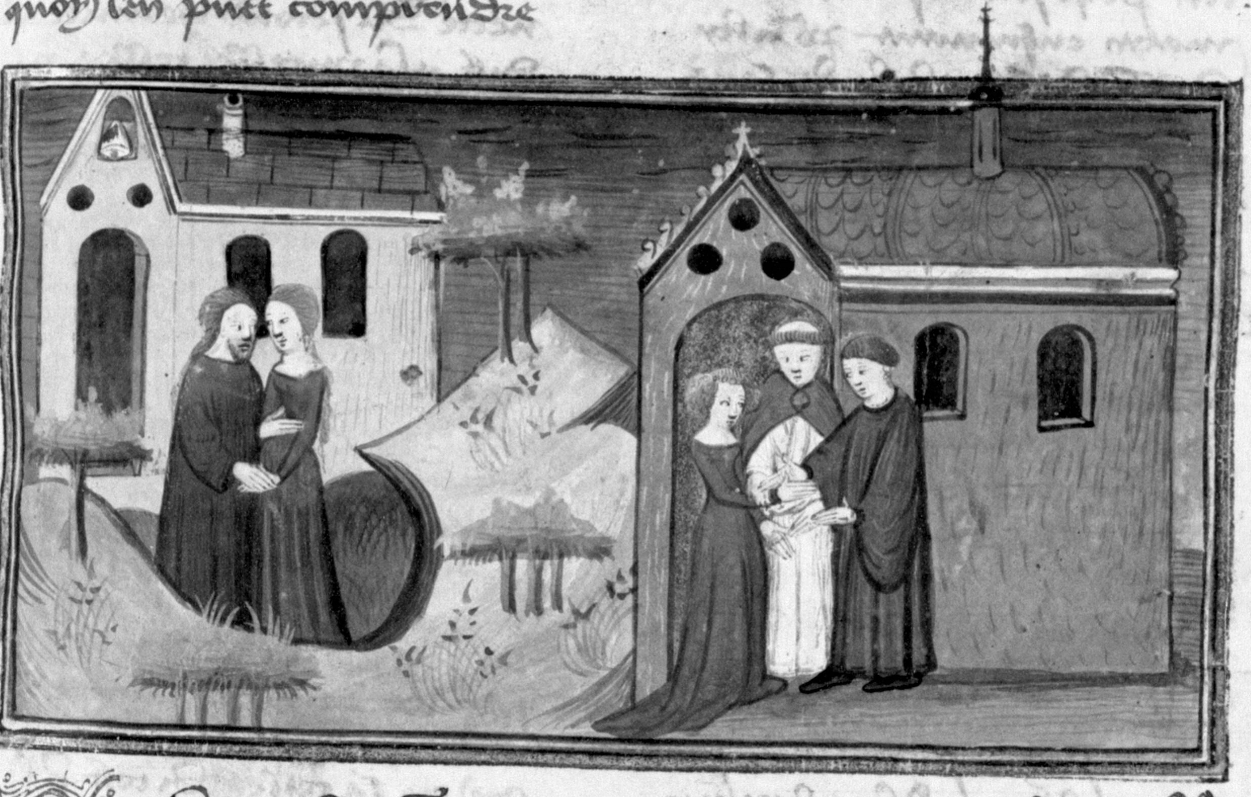 Parigi, Bibliothèque Nationale de France, Fr. 12421, f. 159r. Alibech si trova con l'eremita Rustico; la fanciulla si unisce in matrimonio con Neerbale.