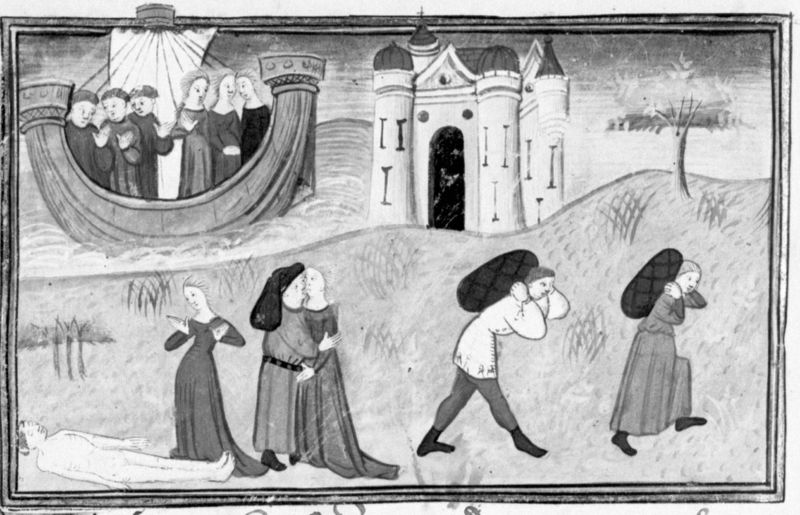 Parigi, Bibliothèque Nationale de France, Fr. 12421, f. 180v. Tre sorelle con i loro mariti salpano verso Creta; sull'isola sono raffigurati Ninetta sul corpo del marito avvelenato, Magdalena mentre bacia il duca di Creta, Bertella e Ughetto in fuga verso Rodi.