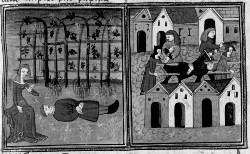 Parigi, Bibliothèque Nationale de France, Fr. 12421, f. 191r. Andreuola trova Gabriotto morto nel giardino; Andreuola e la fantesca, trasportando il corpo di Gabriotto, vengono fermate dal podestà.