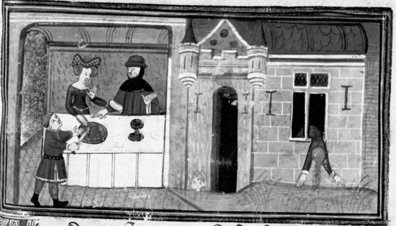 Parigi, Bibliothèque Nationale de France, Fr. 12421, f. 201r. Guiglielmo Rossiglione fa servire alla moglie il cuore dell'amante, Guiglielmo Guardastagno; la donna si getta dalla finestra.