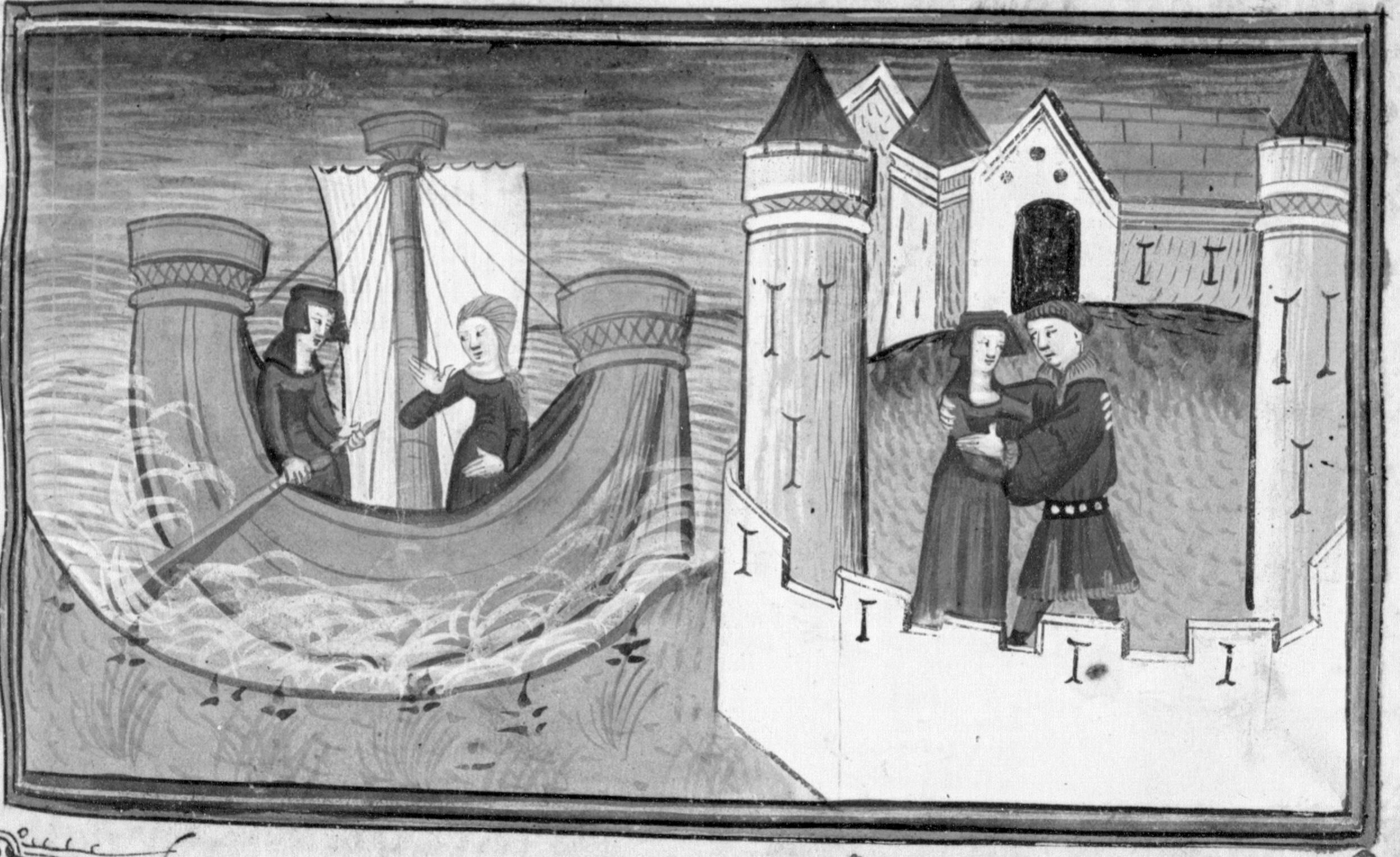 Parigi, Bibliothèque Nationale de France, Fr. 12421, f. 218r. Gostanza si trova alla deriva su una barca insieme ad una serva; Gostanza si ricongiunge con l'amato Martuccio a Tunisi.