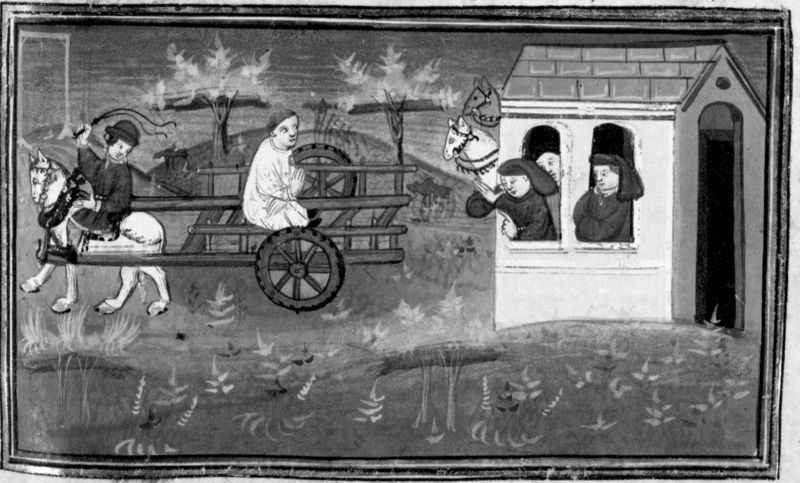 Parigi, Bibliothèque Nationale de France, Fr. 12421, f. 237r. Teodoro viene condotto al luogo del supplizio legato su di un carro, osservato da alcuni uomini affacciati a una finestra.