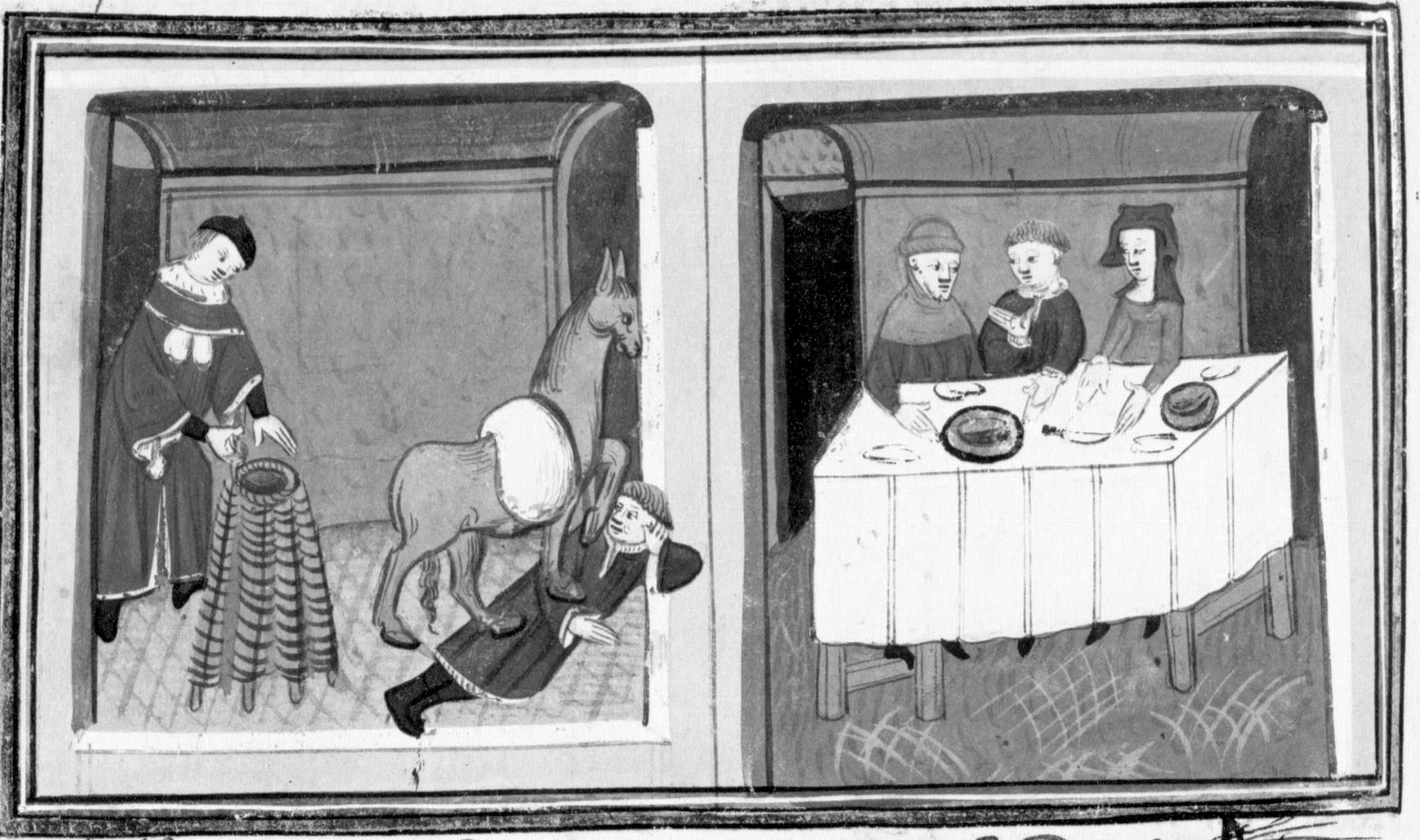Miniatore francese (1425-1450), Pietro di Vinciolo scopre l'amante nella stalla; Pietro di Vinciolo siede a tavola con la moglie e l'amante di lei