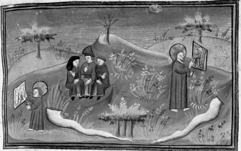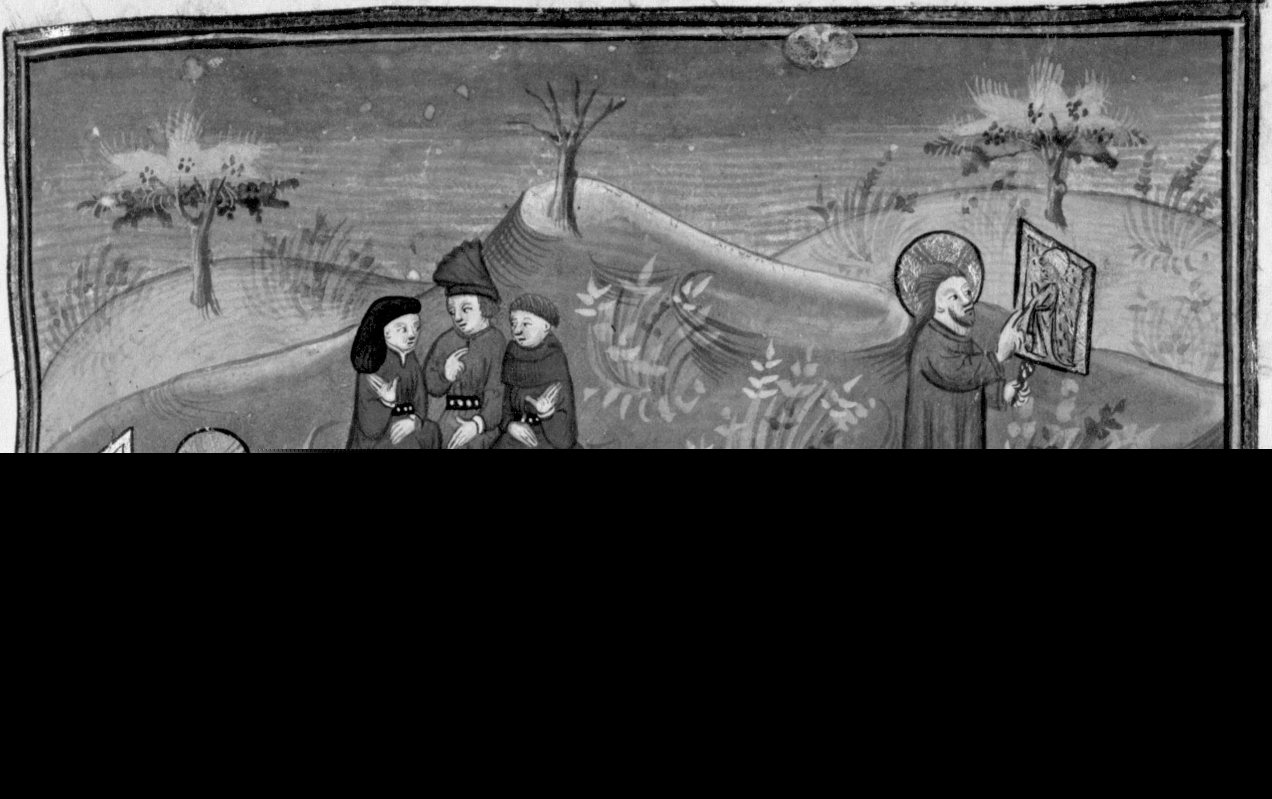 Parigi, Bibliothèque Nationale de France, Fr. 12421, f. 266r. Michele Scalza discute con i suoi amici sulla collina di Montughi; Dio bambino impara a disegnare; Dio adulto mostra un disegno compiuto.