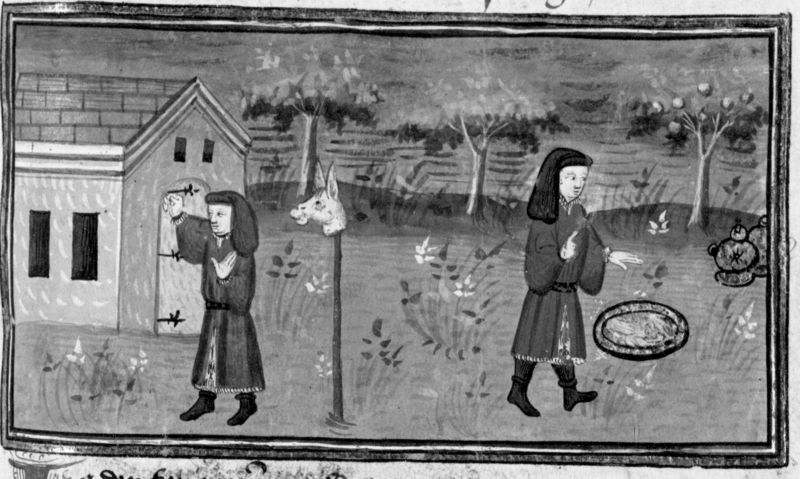 Parigi, Bibliothèque Nationale de France, Fr. 12421, f. 282r. Federigo, avendo visto la testa dell'asino posta come segnale nel vigneto, bussa alla porta di monna Tessa; l'uomo trova del cibo e del vino lasciati sotto un pesco dall'amante.