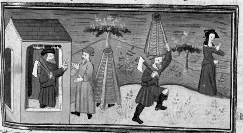 Parigi, Bibliothèque Nationale de France, Fr. 12421, f. 285r. Il marito di Peronella cerca di vendere la botte in cui è nascosto l'amante della donna; Peronella, avendo venduto la botte a Giannello, convince il marito a trasportarla a casa dell'amante.