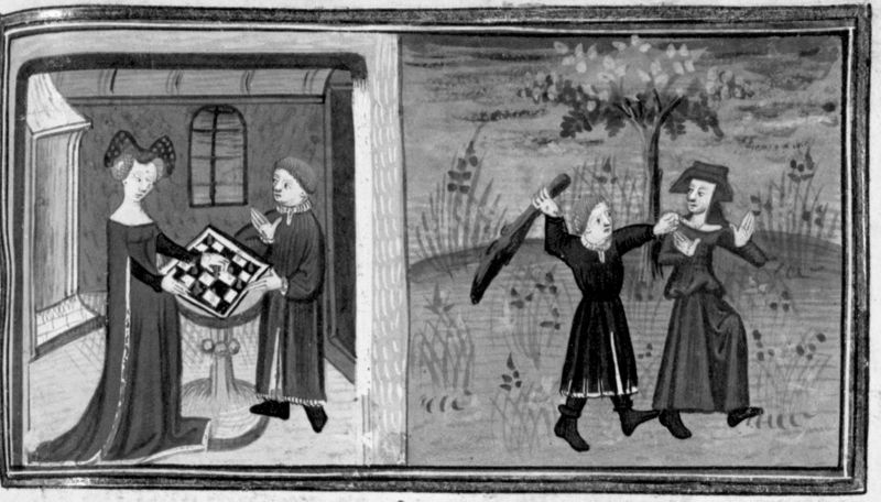 Parigi, Bibliothèque Nationale de France, Fr. 12421, f. 302r. Lodovico gioca a scacchi con Beatrice, lasciandola vincere; Lodovico bastona Egano, il quale è travestito da sua moglie.