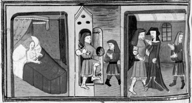 Parigi, Bibliothèque Nationale de France, Fr. 12421, f. 305v. Arriguccio insegue Ruberto fuori la camera da letto dove dorme la moglie; la moglie di Arriguccio accusa il marito davanti al fratello.