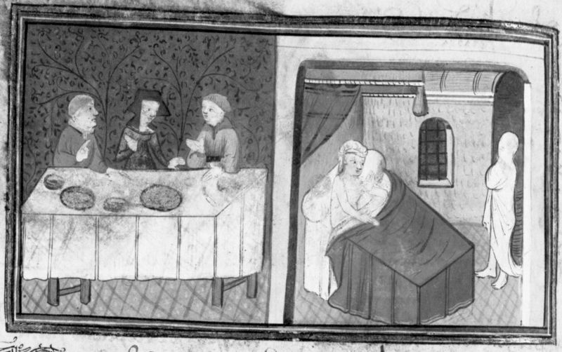 Parigi, Bibliothèque Nationale de France, Fr. 12421, f. 317v. I due amici Tingoccio e Meuccio siedono a tavola con monna Mita; dopo esser morto, Tingoccio appare a Meuccio nella sua stanza.