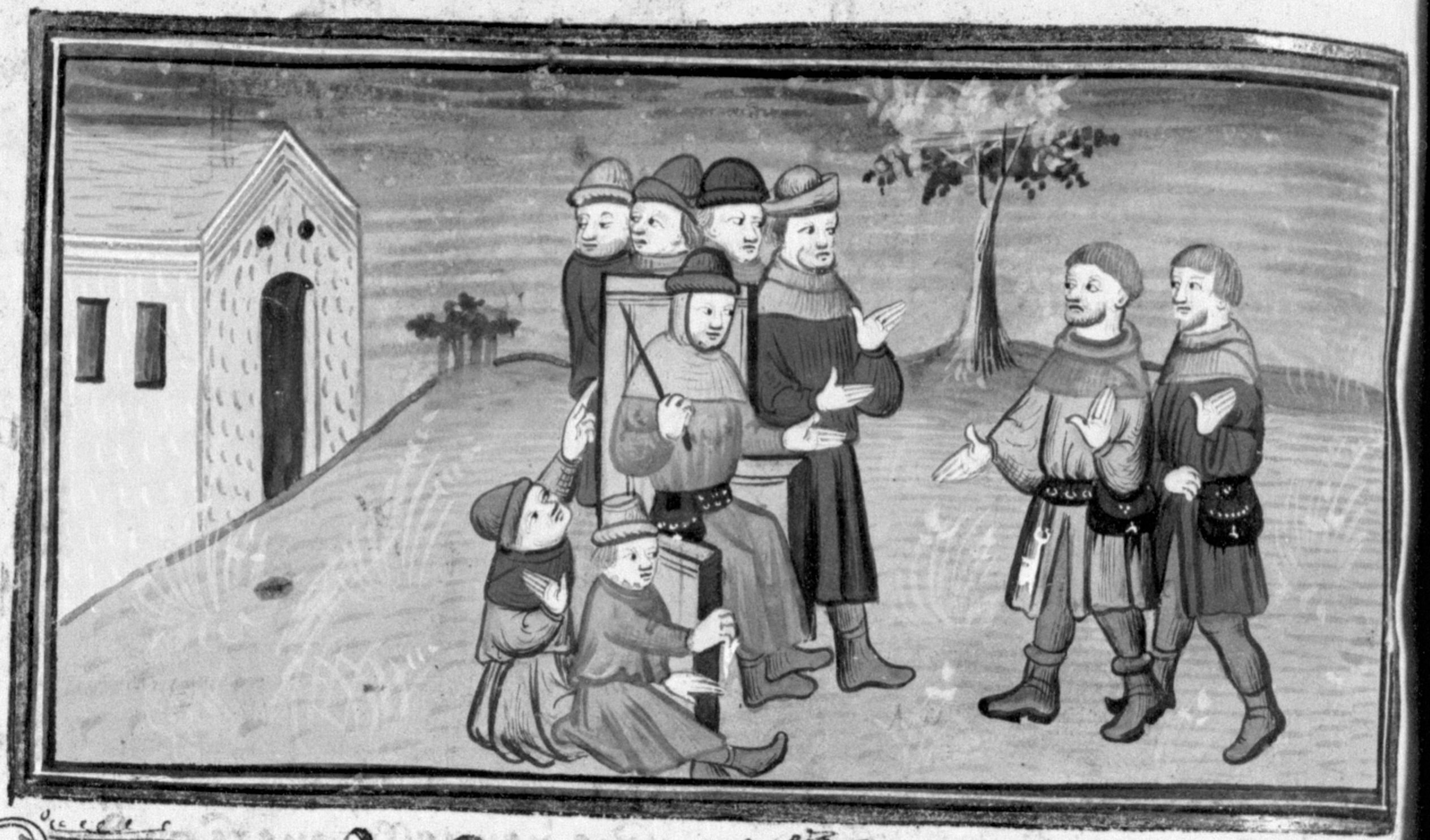 Parigi, Bibliothèque Nationale de France, Fr. 12421, f. 334v. Matteuzzo tira giù le braghe al giudice Nicola mentre questi dirime una finta contesa tra Ribi e Maso del Saggio.