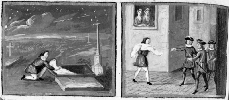 Parigi, Bibliothèque Nationale de France, Fr. 12421, f. 372v. Rinuccio trae un cadavere dalla tomba; giunto sotto la casa di monna Francesca con il corpo sulle spalle, l'uomo incontra delle guardie cittadine.