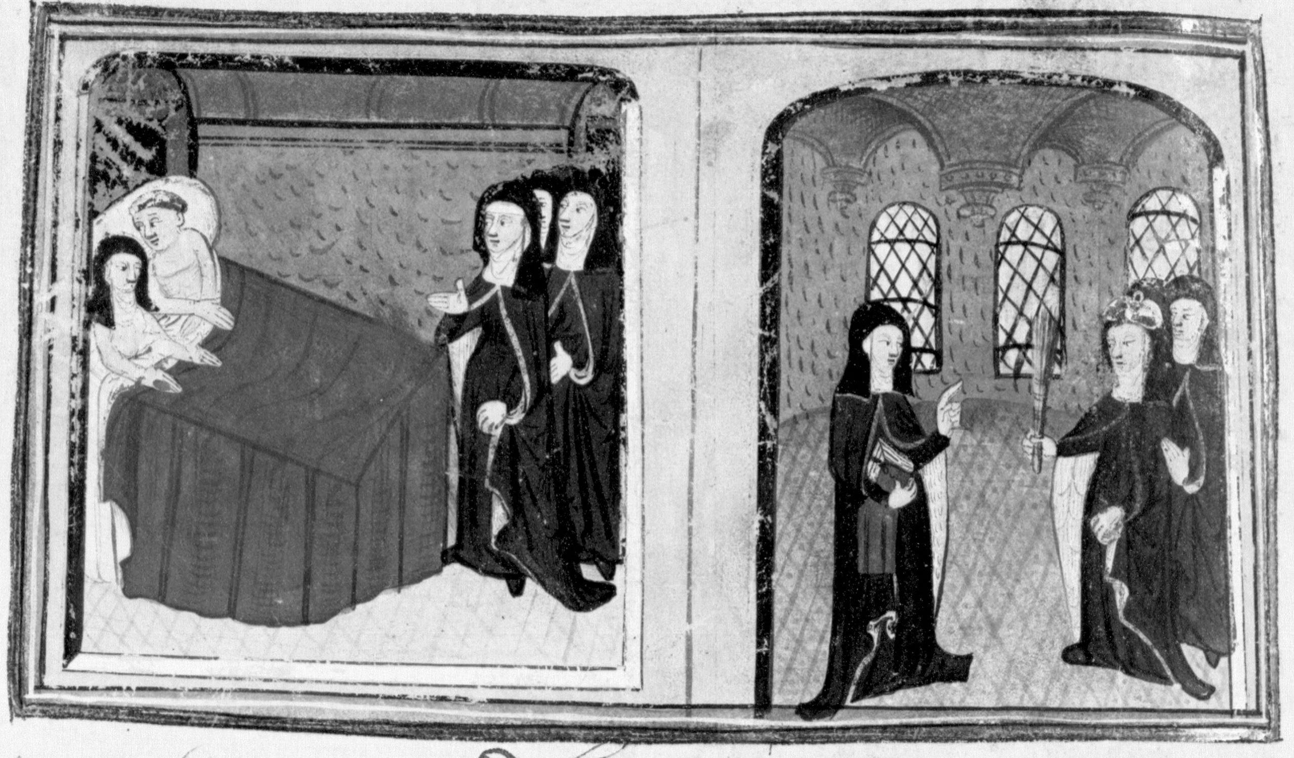 Parigi, Bibliothèque Nationale de France, Fr. 12421, f. 376v. La monaca Isabetta viene sorpresa giacere a letto con un amante; la badessa tenta di rimproverare Isabetta, la quale le fa notare di avere indossato le braghe di un prete al posto del velo.
