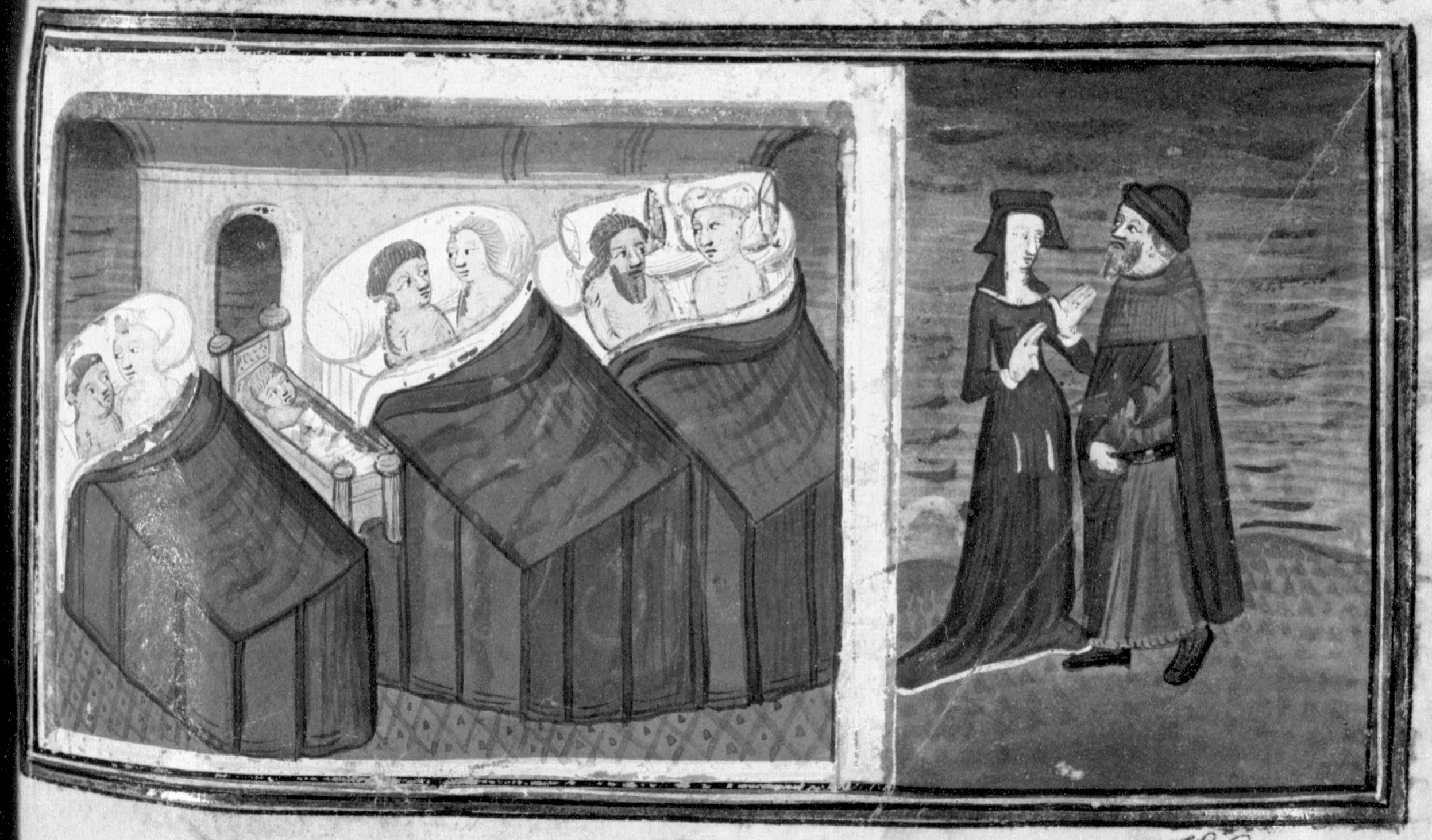 Parigi, Bibliothèque Nationale de France, Fr. 12421, f. 390r. Tre coppie dormono in una camera da letto; la donna placa il marito chiarendo l'equivoco.
