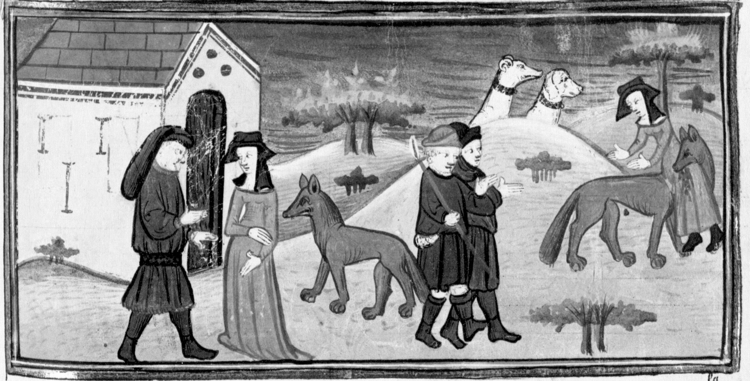 Parigi, Bibliothèque Nationale de France, Fr. 12421, f. 393r. Talano racconta alla moglie il proprio sogno premonitore; la moglie di Talano viene aggredita nel bosco dai lupi e soccorsa dai pastori.
