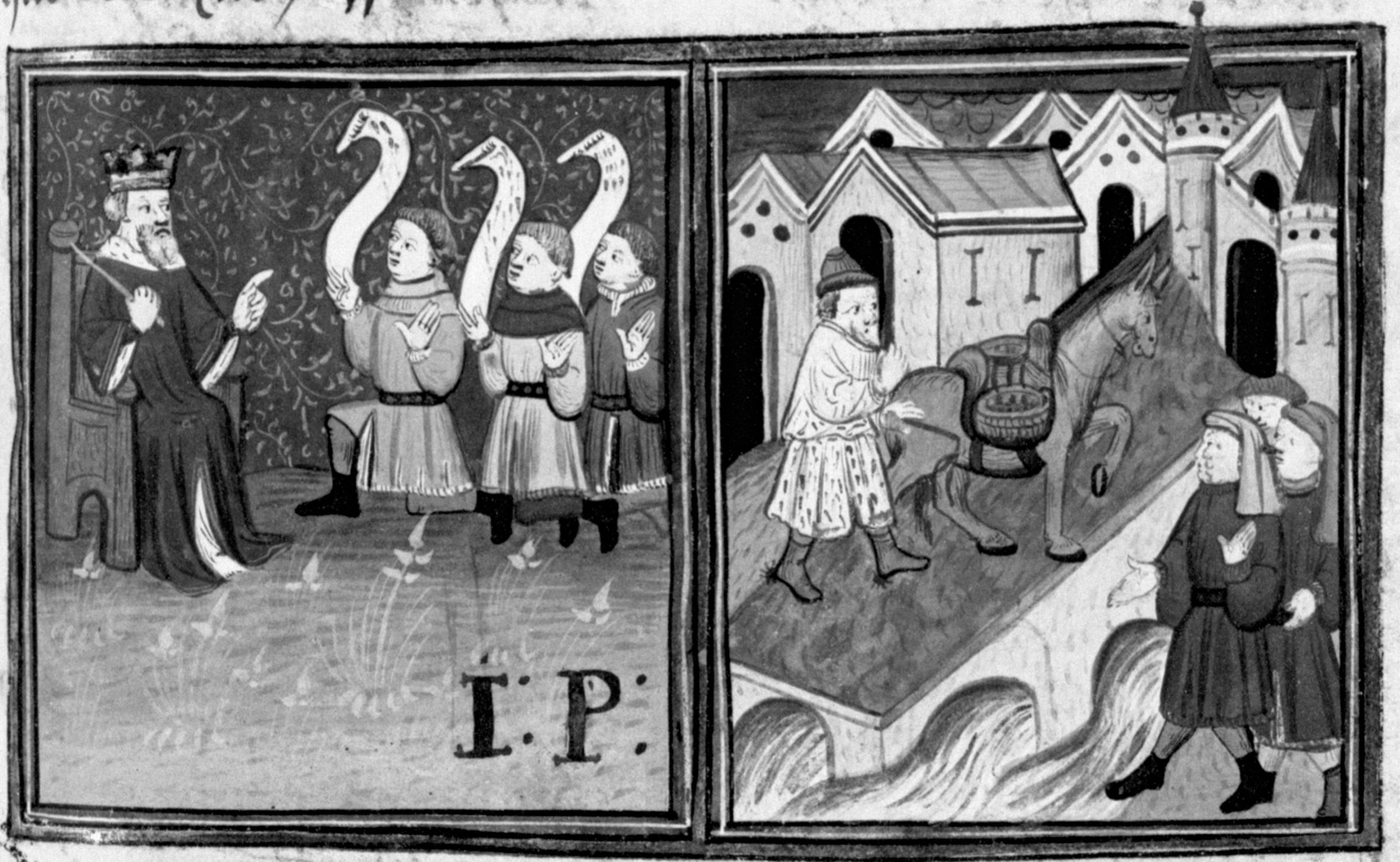 Parigi, Bibliothèque Nationale de France, Fr. 12421, f. 398r. Re Salomone dispensa il proprio giudizio; Giosefo e Melisso sulla via del ritorno incontrano un pastore con la sua mula bloccato sul ponte dell'Oca.