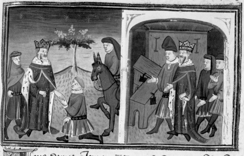 Parigi, Bibliothèque Nationale de France, Fr. 12421, f. 406r. Ruggieri si congeda da re Alfonso d'Aragona ricevendo in dono una mula; il re invita Ruggieri a scegliere tra due forzieri.