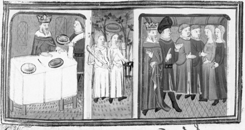Parigi, Bibliothèque Nationale de France, Fr. 12421, f. 422r. Re Carlo I, ospite di Neri degli Uberti, osserva le figlie del cavaliere uscire per andare a pesca; il re fa sposare le fanciulle con due baroni.