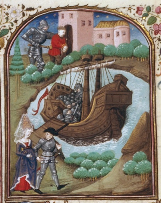 Cambridge (Mass.), Harvard University, Houghton Library, Richardson 31, f. 123v. Cimone viene imprigionato; Cimone fugge con Efigenia su una nave.