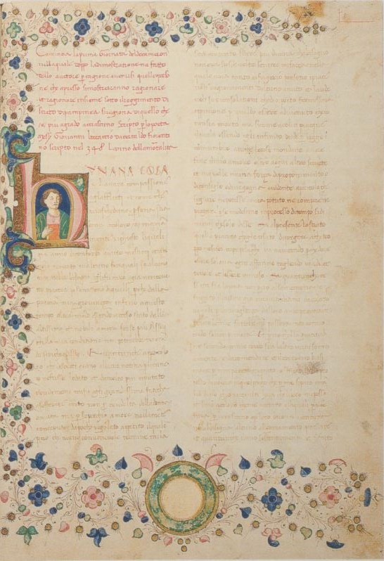 Città del Vaticano, Biblioteca Apostolica Vaticana, Chig.M.VII.46, f. 1r. Il copista del manoscritto è Filippo d'Andrea da Bibbiena. Ritratto a mezzobusto del Boccaccio che regge un libro, all'interno dell'iniziale figurata H(umana).