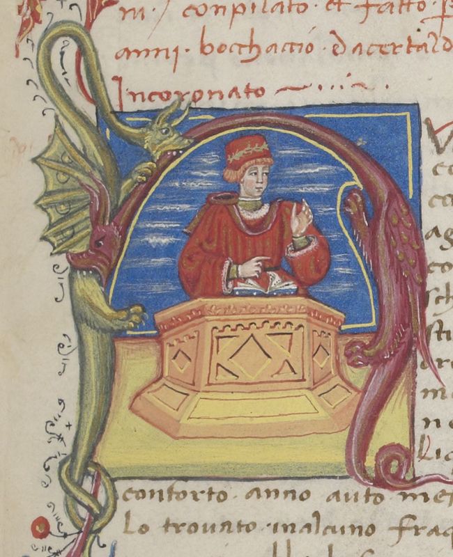Parigi, Bibliothèque Nationale de France, It. 487, f. 12r. L'autore dell'opera, Giovanni Boccaccio, è raffigurato in cattedra con un libro aperto dinanzi a sé, all'interno di un'iniziale zoomorfa figurata H(umana).