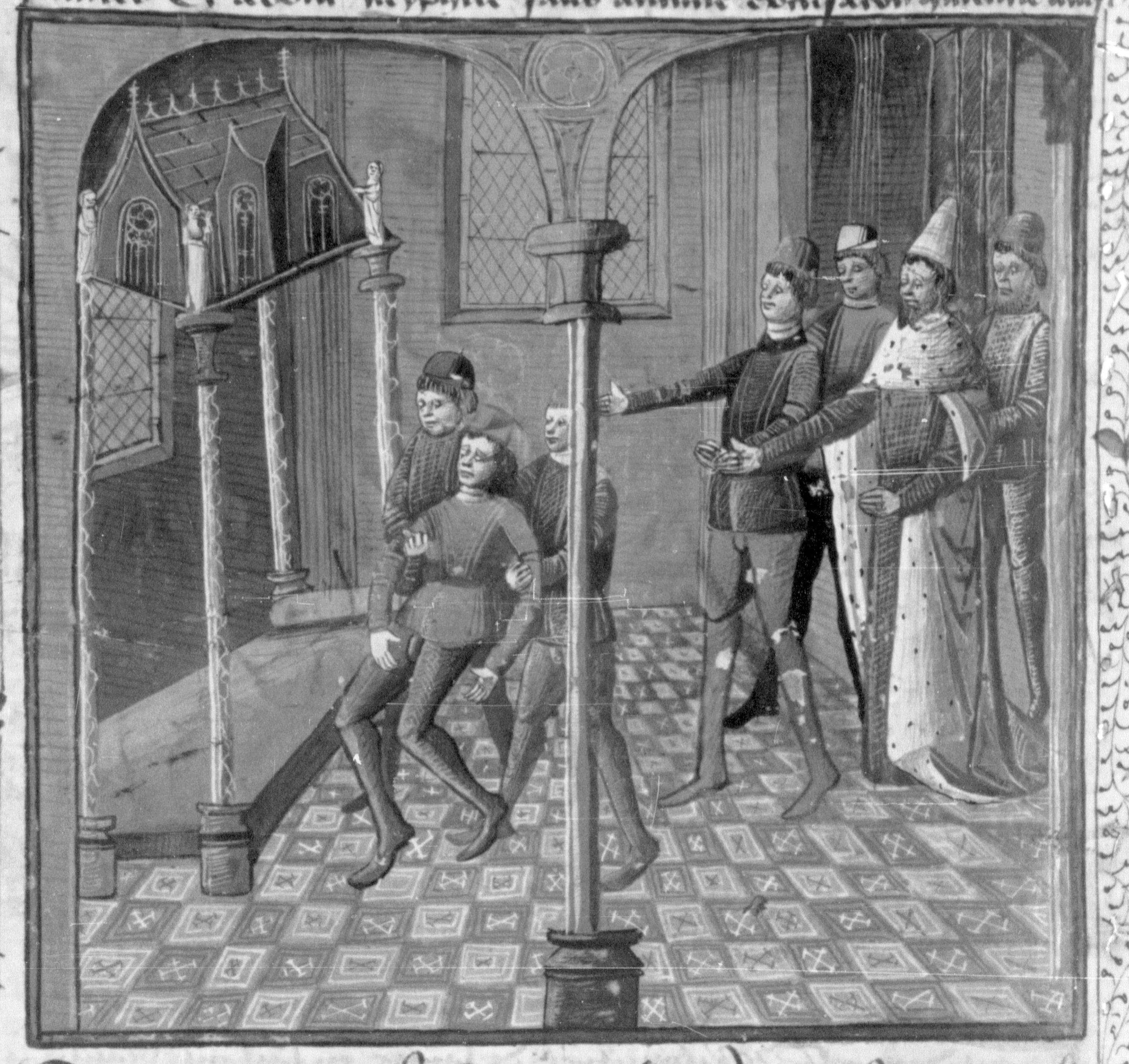 Parigi, Bibliothèque Nationale de France, Fr. 240, f. 29v. All'interno di una chiesa Martellino, fingendosi paralitico e sorretto da due amici, viene condotto presso l'arca in cui riposa il corpo di Sant'Arrigo.