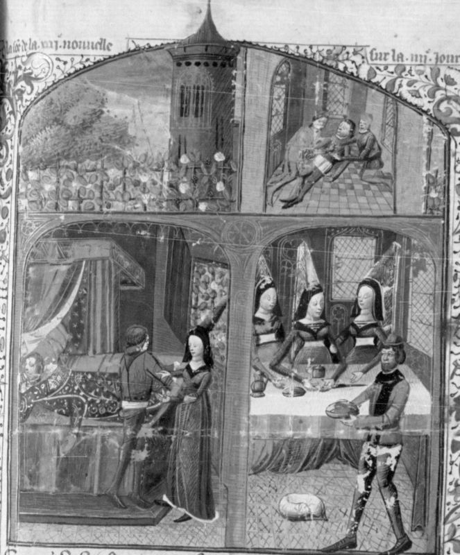 Parigi, Bibliothèque Nationale de France, Fr. 240, f. 104r. Mentre il padre Tancredi è addormentato, Ghismonda riceve di nascosto l'amante Guiscardo; Guiscardo viene strangolato da due uomini agli ordini di Tancredi; Ghismonda riceve il cuore dell'amato servito su di un piatto.