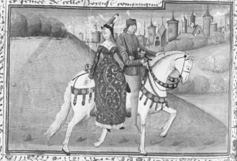 Parigi, Bibliothèque Nationale de France, Fr. 240, f. 172v. Madonna Oretta accetta di cavalcare insieme al proprio accompagnatore.