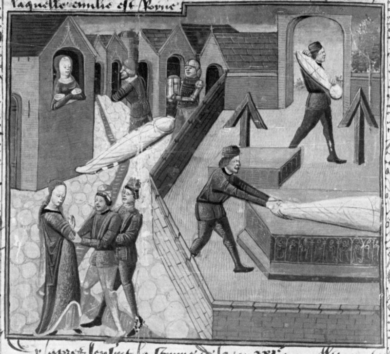 Parigi, Bibliothèque Nationale de France, Fr. 240, f. 253v. Francesca parla con i suoi amanti Rinuccio e Alessandro, assegnando a ciascuno un compito; Rinuccio dissotterra un cadavere dal cimitero e lo trasporta sotto la casa di Francesca, per poi abbandonarlo all'arrivo di una guardia.