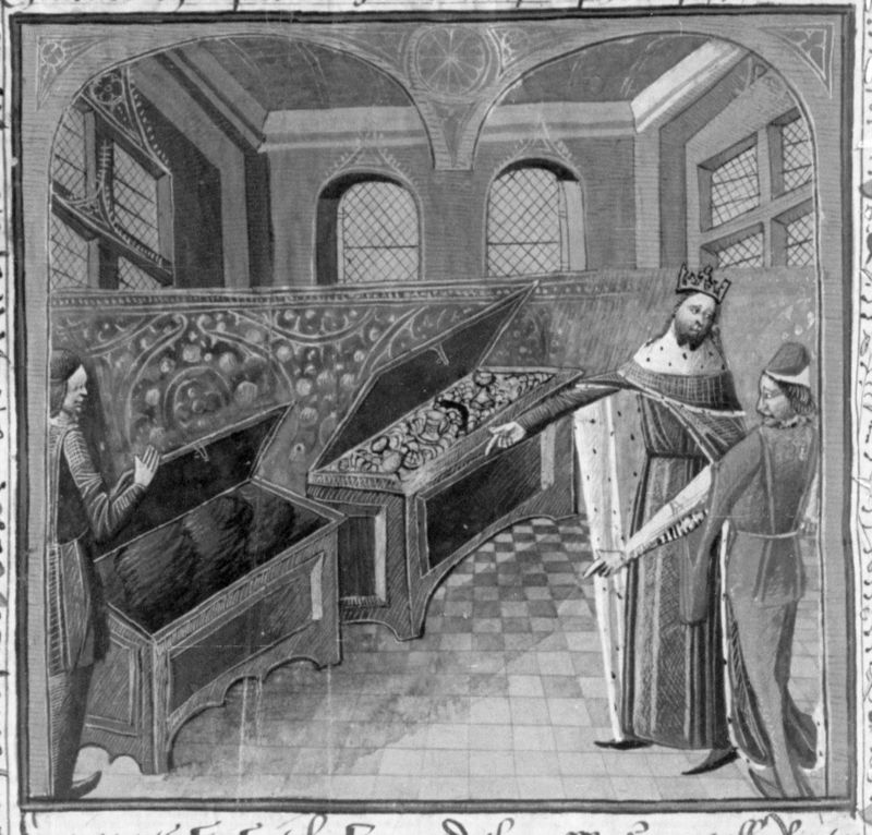 Parigi, Bibliothèque Nationale de France, Fr. 240, f. 277v. Re Alfonso d'Aragona rivela a Ruggieri il contenuto di due forzieri, uno pieno d'oro ed uno pieno di terra.