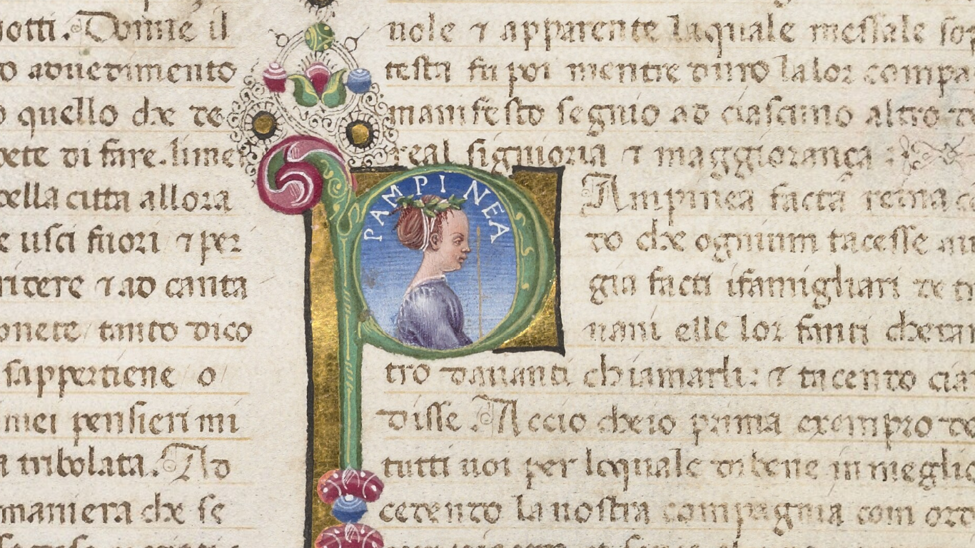 Oxford, Bodleian Library, Holkham misc. 49, f. 9v. Busto di Pampinea, regina della prima giornata, all'interno dell'iniziale figurata P(ampinea).