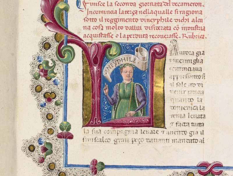 Oxford, Bodleian Library, Holkham misc. 49, f. 46r. Busto di Neifile, regina della terza giornata, all'interno dell'iniziale figurata L('aurora).