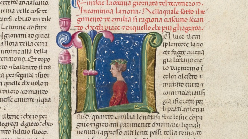 Oxford, Bodleian Library, Holkham misc. 49, f. 137v. Busto di Emilia, regina della nona giornata, all'interno dell'iniziale figurata L(a luce).