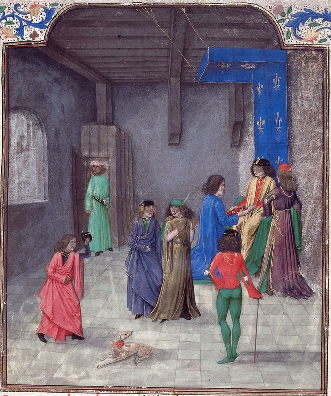 Londra, British Library, Royal 19 E I, f. 1r. Laurent de Premierfait presenta la sua traduzione francese del Decameron al duca Jean di Berry.