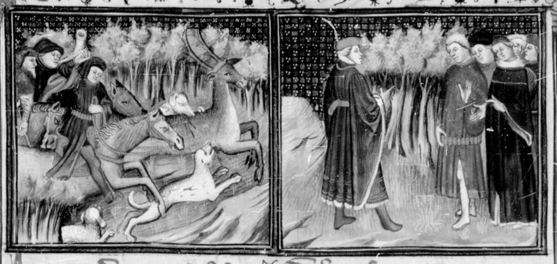 Parigi, Bibliothèque Nationale de France, Fr. 12459, f. 135r. Il copista del manoscritto, datato 21 aprile 1414, è Jehan de Lengres. Gualtieri di Saluzzo va a caccia di un cervo con i suoi cortigiani; una delegazione di sudditi esorta il marchese a prender moglie.