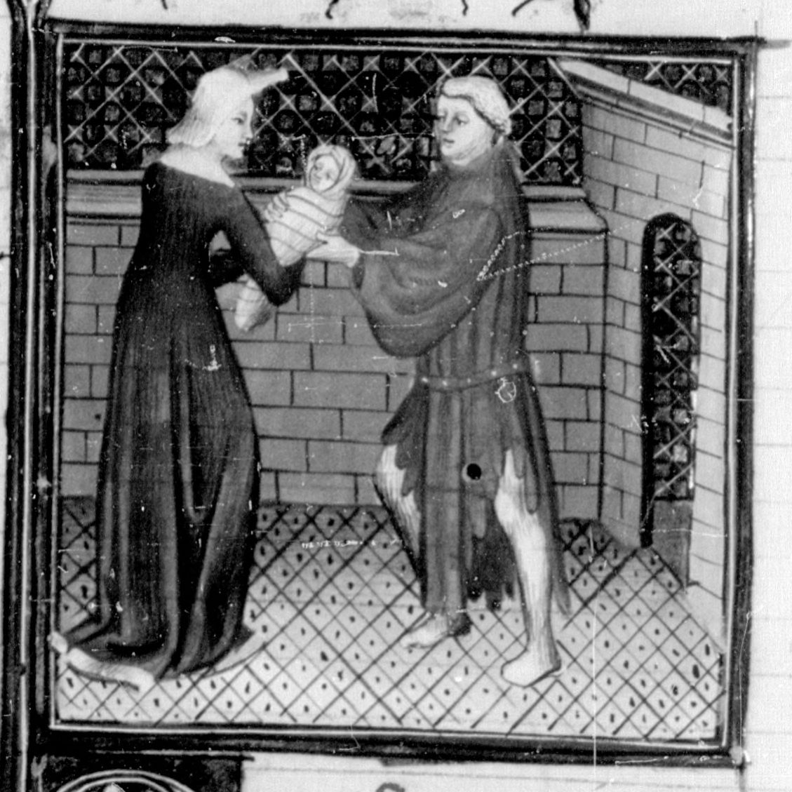 Parigi, Bibliothèque Nationale de France, Fr. 12459, f. 139r. Il copista del manoscritto, datato 21 aprile 1414, è Jehan de Lengres. Griselda si separa dal figlio, consegnandolo al messo mandato da Gualtieri.