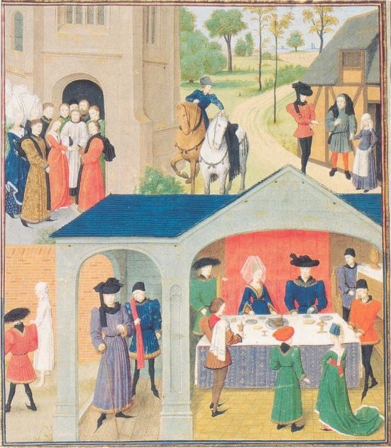 Bruxelles, Koninklijke Bibliotheek van België, 9232, f. 444v. La miniatura riassume diverse scene della novella di Griselda: in alto a sinistra, Gualtieri di Saluzzo sposa Griselda; in alto a destra, Gualtieri si reca presso la casa di Giannucole per chiederne la figlia in sposa; in basso a sinistra, Gualtieri ripudia Griselda, la quale lascia la casa con indosso solo un camicia; in basso a destra, all'interno del castello del marchese, Gulatieri conversa con un personaggio, quindi si svolge il banchetto finale durante il quale Griselda si ricongiunge con i suoi figli.