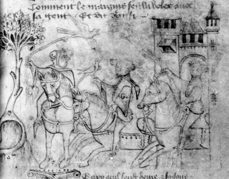 Parigi, Bibliothèque Nationale de France, Fr. 2203, f. 3r. Il manoscritto è datato 1395. Gualtieri si reca a caccia col falcone accompagnato dal suo seguito.