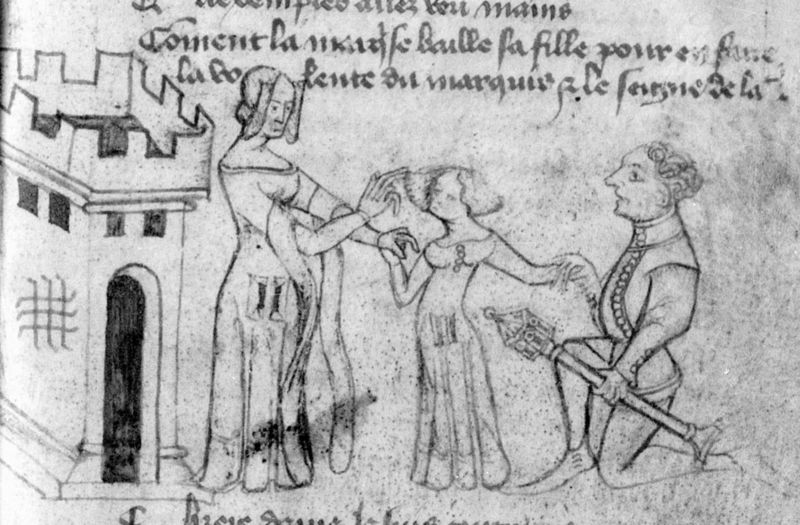 Parigi, Bibliothèque Nationale de France, Fr. 2203, f. 31r. Il manoscritto è datato 1395. Griselda consegna sua figlia al messo inviato da Gualtieri.