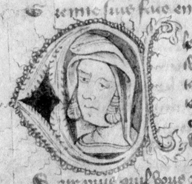 Parigi, Bibliothèque Nationale de France, Fr. 2203, f. 42v. Il manoscritto è datato 1395. Testa di un personaggio maschile (Boccaccio?), all'interno dell'iniziale figurata C(hevaliere).