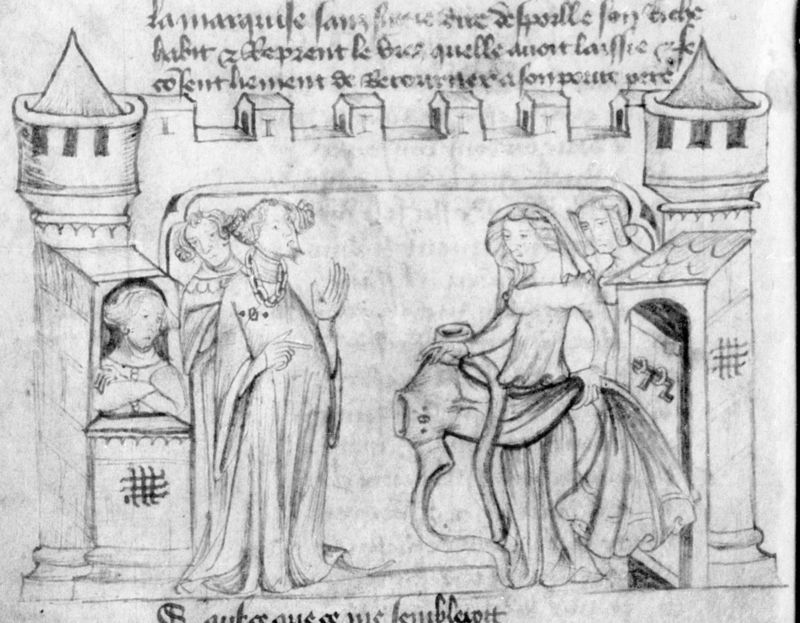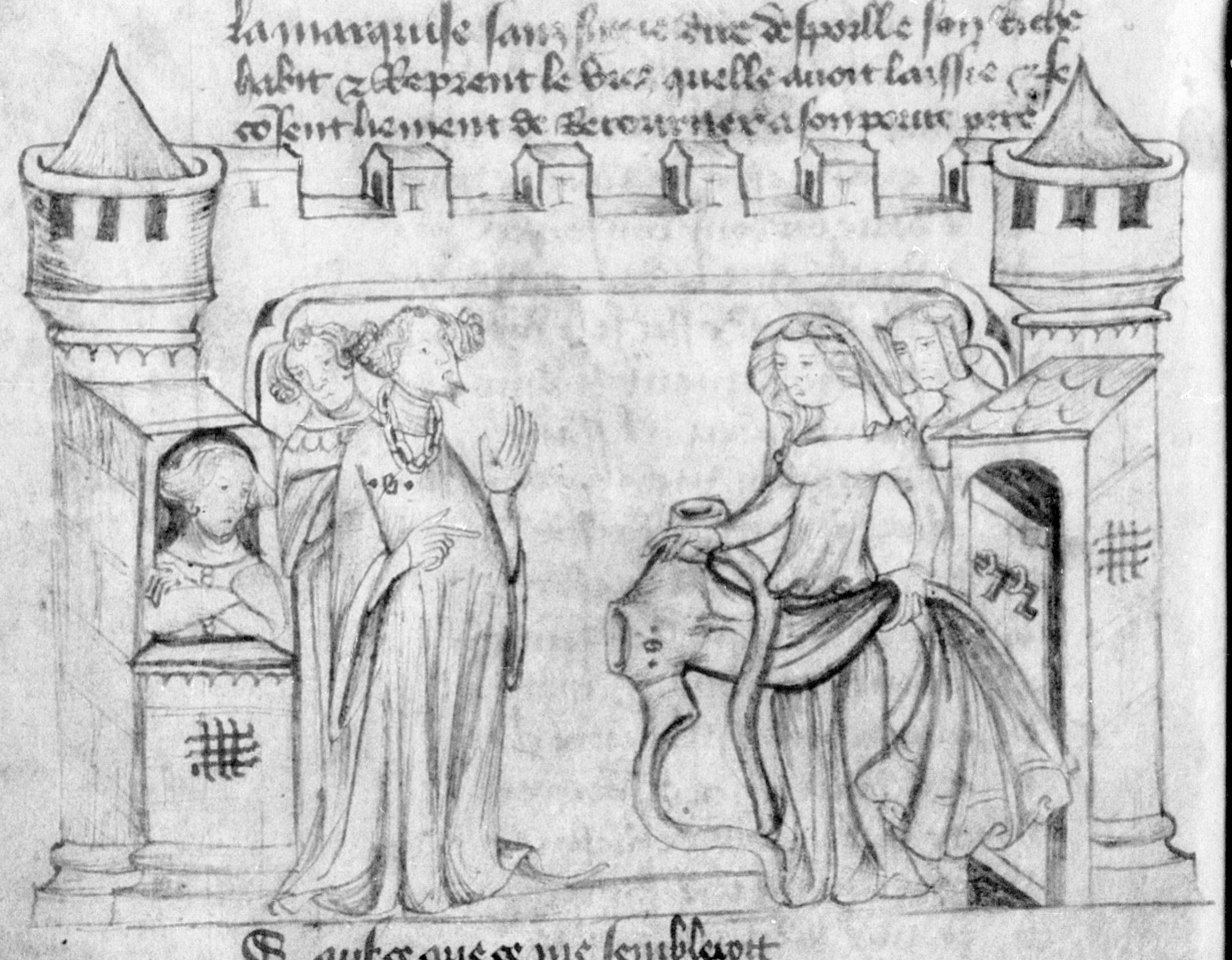 Parigi, Bibliothèque Nationale de France, Fr. 2203, f. 44v. Il manoscritto è datato 1395. Griselda viene ripudiata da Gualtieri e costretta a spogliarsi delle vesti marchionali.